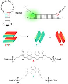 Molecular beacons (MBs) are fluorescent nucleic acid probes with a stem-loop structure. In our approach, we have developed an excimer-controlled MB with non-nucleosidic chromophores in the stem. Excimer fluorescence is inhibited by formation of a donor-acceptor complex between alkynylpyrene and perylenediimide units results in an excellent reduction of background signal, which allows the sensitive detection of target DNA and RNA even in the presence of significant excess of the probe. In combination with bright excimer fluorescence target detection is rendered possible at low nanomolar concentrations.