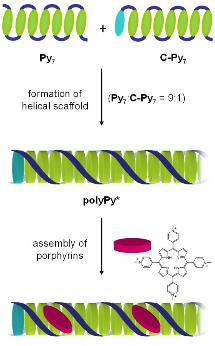 We found that oligopyrenotides can serve as a chiral nanoscale template for the assembly of cationic porphyrins. The polymer-ligand aggregate resembles the well-characterized H2TMPyP-poly(dA:dT) complex. Oligopyrenotides represent valuable alternatives to DNA scaffolds with substantially different electronic properties.